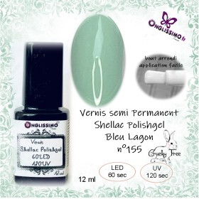 Vernis Permanent Shellac Polishgel Onglissimo UV & LED. 155 Bleu Lagon. Cruelty free.12ml. S'applique sur ongles naturels, capsule, gel de construction, acrylgel. Brillance. Tenue 3 semaines. Résistant aux chocs. Application facilitée grâce à son pinceau rond.